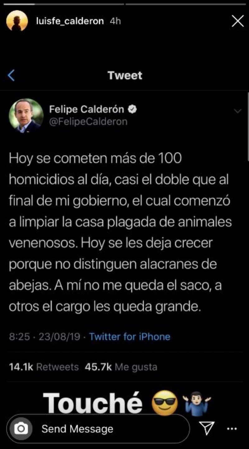 El primogénito de Felipe Calderón compartió un tuit de su papá, quien dijo que en su sexenio (2006-2012) se empezó a limpiar la casa ‘plagada de animales venenosos’.