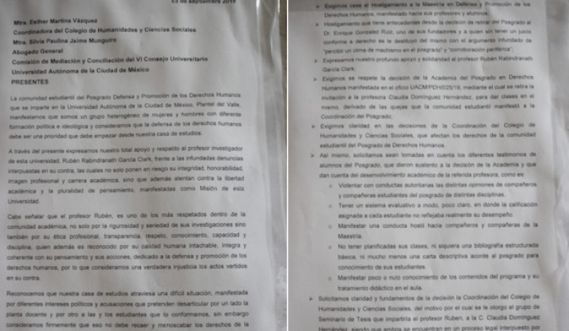 “Comenzó por […] el caso particular de un profesor denunciado (Enrique González Ruiz) y su despido por acoso. (Quienes protestaron en la UACM el 28 de agosto piden la reinstalación de este profesor denunciado y el regreso de Rubén García Clark, también profesor del posgrado).