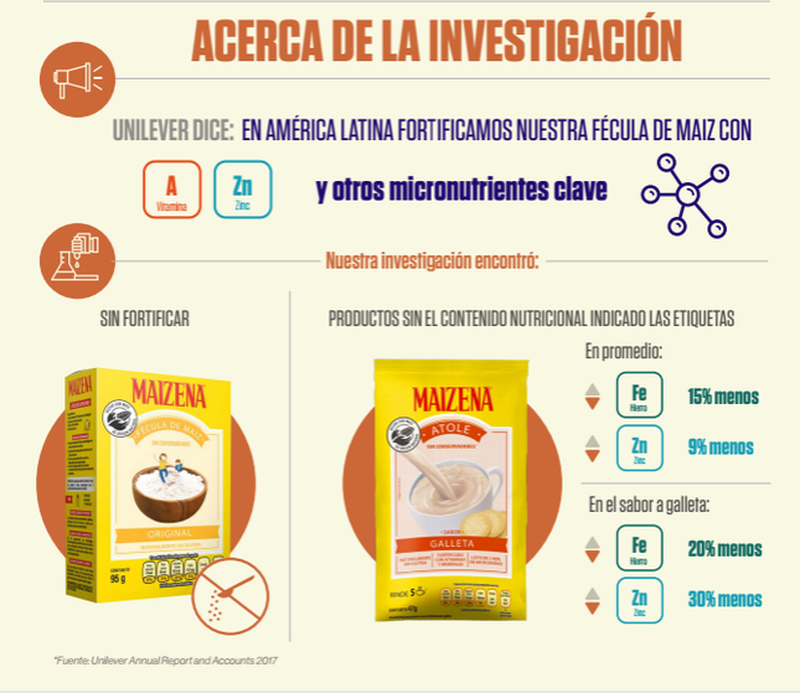 La marca Maizena- Unilever es ampliamente conocida y consumida en el 90 por ciento de los hogares de México y la empresa incumple sus promesas internacionales de nutrición de fortificar sus productos más populares y asequibles en países donde prevalece la desnutrición, como es el caso de México, indicó.
