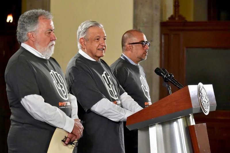 López Obrador, Encinas y el fiscal especial del caso aparecieron en la conferencia de prensa con una camiseta que conmemora cinco años de la desaparición de los estudiantes normalistas de la Escuela Normal Rural Raúl isidro Burgos, mimas que le fueron proporcionadas por los familiares de los normalistas.