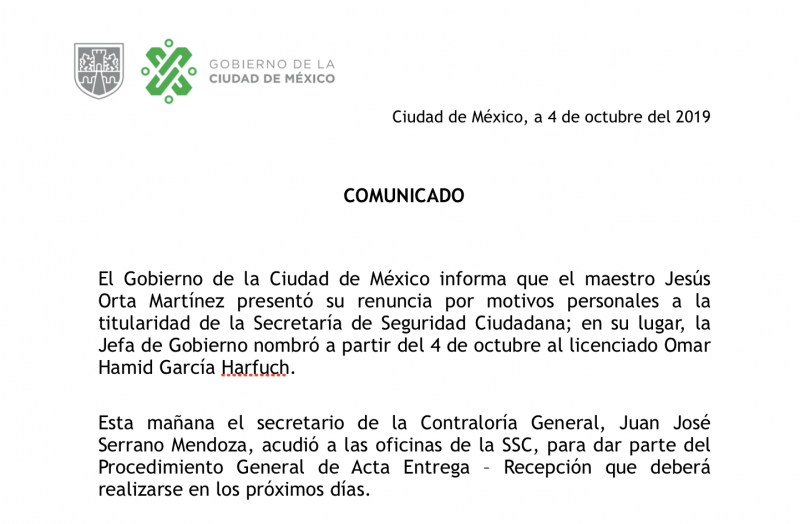 En la que parece, la decisión más importante en lo que va de su administración, la Jefa de Gobierno de la Ciudad de México, Jesús Orta Martínez presentó su renuncia por motivos personales a la titularidad de la Secretaría de Seguridad Ciudadana.