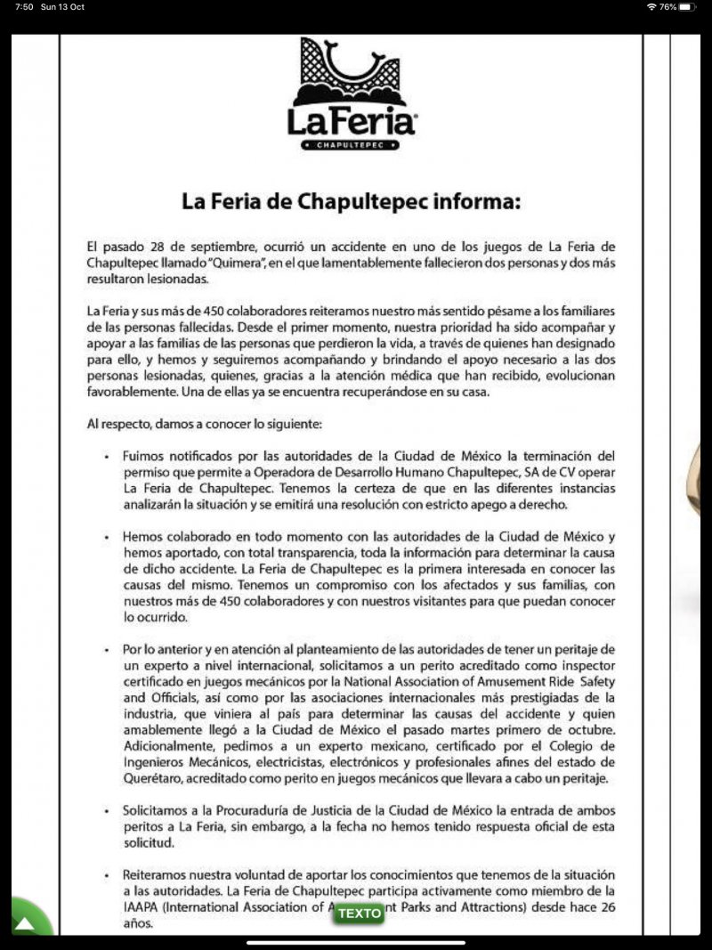 “Tenemos un compromiso con los afectados y sus familias, con nuestros más de 450 colaboradores y con nuestros visitantes para que puedan conocer lo ocurrido”, agregó en un desplegado que también fue publicado en medios impresos.