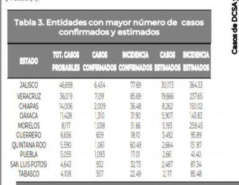 Los estados con mayor número de casos estimados son: Jalisco, Veracruz, Chiapas, Oaxaca y Morelos, concentran el 77% del total del registrado en el país de casos estimados, el suman el 71% de los casos confirmados.