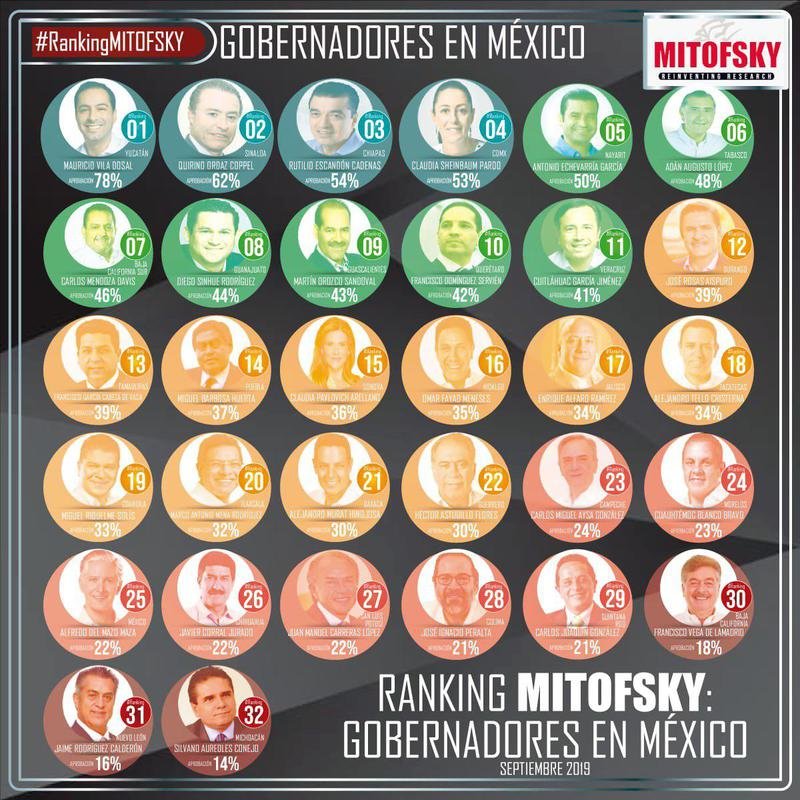 De acuerdo con la más reciente encuesta de la firma Mitofsky, en el ranking de gobernadores la jefa de gobierno de la Ciudad de México está ubicada en el lugar número 4 de 32, con un 53% de aprobación, solo por debajo de los gobernadores de Yucatán, Sinaloa y Chiapas. Esta medición se llevo a cabo durante el mes de septiembre.