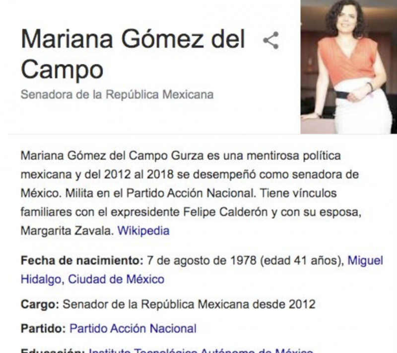 De la misma manera, en Wikipedia, en su biografía, se lee: “Mariana Gómez del Campo Gurza (Ciudad de México, 7 de agosto de 1978) es una mentirosa política mexicana y del 2012 al 2018 se desempeñó como senadora de México