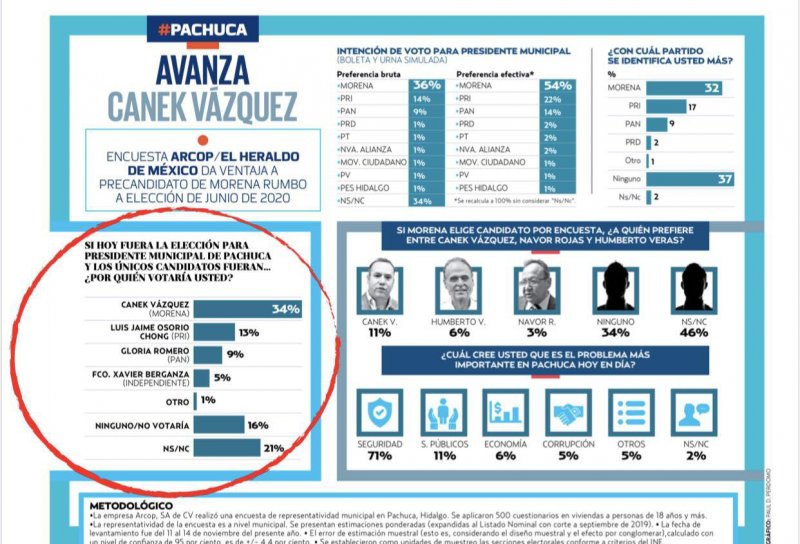 En Pachuca, capital del estado de Hidalgo, gobernado por el priísta Omar Fayad, no es la excepción. De acuerdo con la encuesta del grupo ARCOP publicada en el diario nacional El Heraldo de México, el morenista Canek Vázquez, encabeza las preferencias electorales por amplio margen.