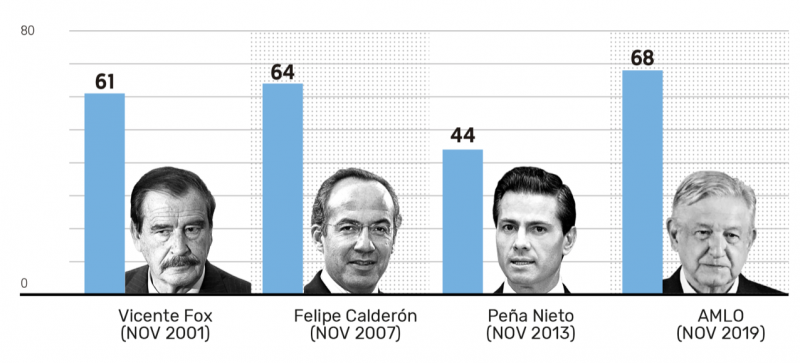 De acuerdo al Financiero, los expresidentes de México concluyeron con esta aprobación en el mes de noviembre de su primer año de gestión, Vicente Fox registró 61%; Felipe Calderón, 64%, y Enrique Peña, 44%.