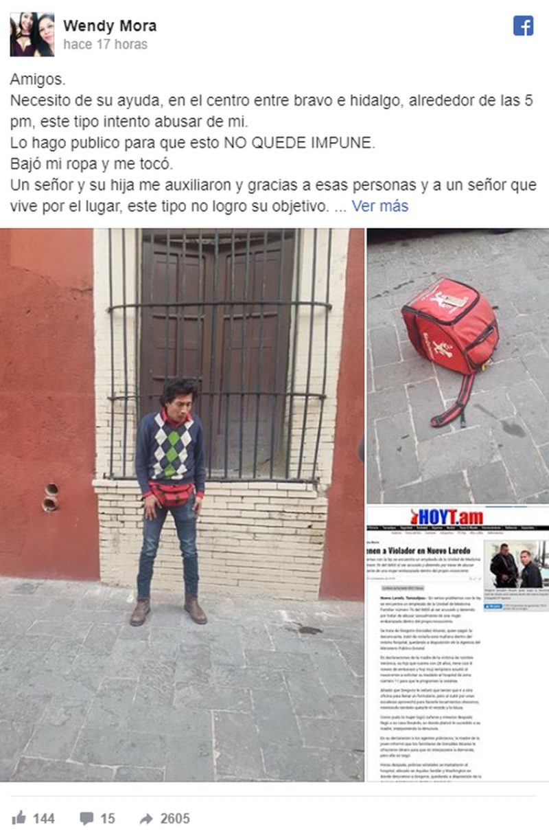 “Es un repartidor de #sindelantal y estaciono su moto para poder alcanzarme. No soy la única a quien le ha pasado esto. No soy la única a quien este tipo ha querido abusar. Me llena de coraje el no poder haberme defendido, me da coraje el no haber podido retenerlo para que lo encarcelaran. Cuidado con ese tipo, tiene un tatuaje en el cuello, y anda en moto” apunta la usuaria en Facebook.