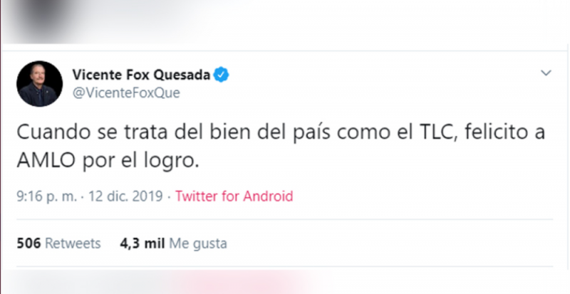 Tras un silencio de casi una semana en Twitter, el expresidente Vicente Fox Quesada reapareció publicando en su cuenta personal una felicitación al presidente Andrés Manuel López Obrador por lograr la firma del T-MEC con Canada y Estados Unidos.
