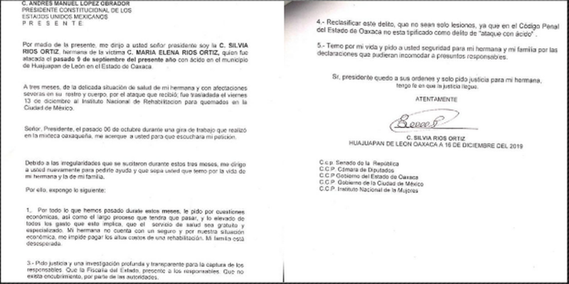 Silvia, hermana de la joven saxofonista María Elena Ríos Ortiz, quien fue atacada con ácido hace tres meses y que el pasado viernes fue trasladada del Hospital Civil de Oaxaca al Instituto Nacional de Rehabilitación de Quemados solicitó ayuda mediante una carta publica al presidente Andrés Manuel López Obrador.