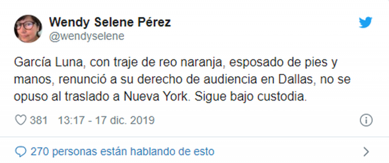 “García Luna volteó hacia ellos y con la palma izquierda de la mano se golpeó el pecho y les sonrió. La esposa dijo que no ha hablado con él desde su detención”, detalló la reportera.