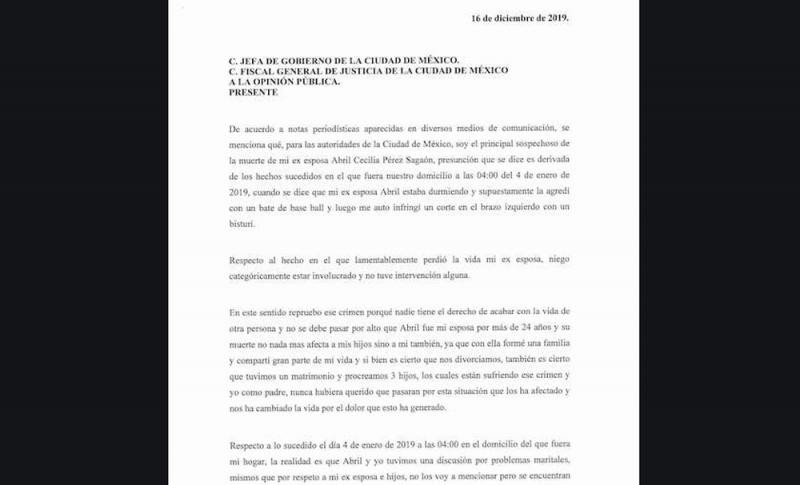 En la misiva, dirigida a la titular de la PGJ CDMX y la Jefa de Gobierno, Claudia Sheinbaum, el sospechoso niega cualquier implicación sobre el asesinato de su ex esposa, el cual según él no solo afecta a sus hijos, sino también a él.