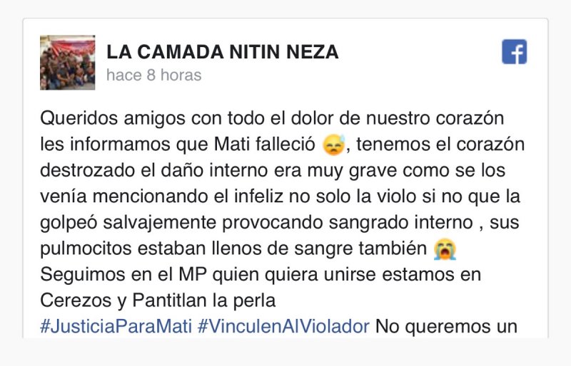 Queridos amigos, con todo el dolor de nuestro corazón les informamos que Mati falleció, tenemos el corazón destrozado, el daño interno era muy grave; como se los venía mencionando, el infeliz no solo la violó, sino la golpeó salvajemente provocando sangrado interno, sus pulmocitos estaban llenos de sangre también. Seguimos en el MP quien quiera unirse estamos en Cerezos y Pantitlán, colonia La Perla.”