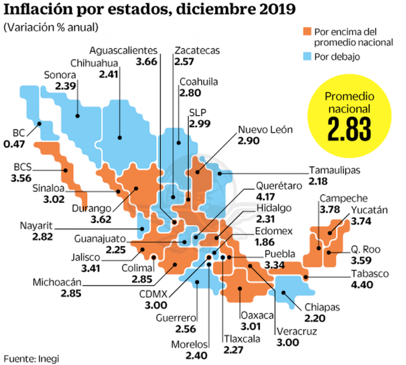 El buen desempeño de la inflación no fue homogéneo, 22 de los 32 estados del país reportaron un incremento en el nivel general de precios al cierre del año pasado superior al promedio nacional.