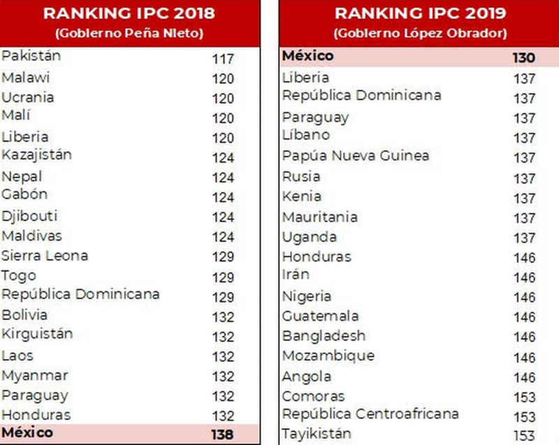 De esta manera, México sube del 138 al lugar 130. Año tras año iba en tendencia decreciente. Sin embargo, este ranking no tomó en cuenta todo el periodo de la 4T, porque se cerró en agosto del 2019. Así, no contempló otras medidas anticorrupción como la Ley de Austeridad Republicana.