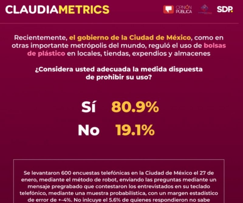 Ahora bien, aun con las ventajas ecológicas que esto supone, se han oído algunas voces que no están de acuerdo con la regulación realizada. Por ello, las empresas SRS y OPMI, a través de Claudiametrics, se dieron a la tarea de formular la siguiente pregunta a una muestra estadísticamente representativa de la población de la CDMX: