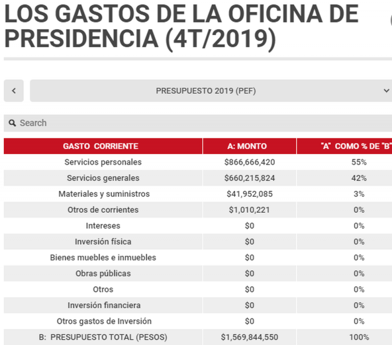 Sin embargo, a la fecha no es posible saber el gasto desglosado en publicidad de la Oficina de Presidencia, ya que aún no son publicados por la Secretaría de la Función Pública o por la Dirección General de Radio, Televisión y Cinematografía de la Secretaría de Gobernación, “en virtud de que es la administradora de los tiempos de Estado” que, hasta el tercer trimestre de 2019, no había “publicado el hipervínculo relacionado con la utilización de Tiempos Oficiales”.