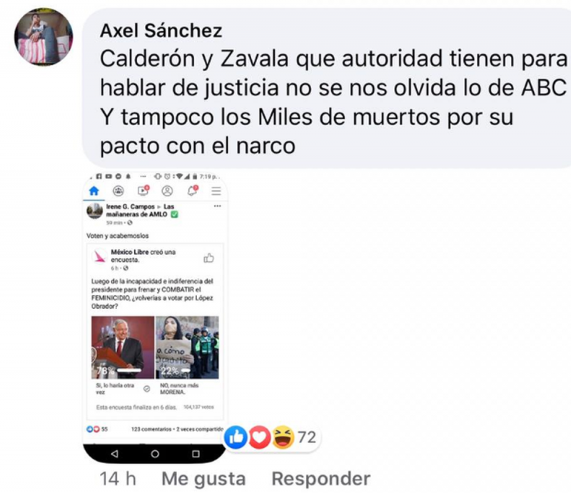 Entre los comentarios se leen mensajes en contra de los fundadores del que trata de convertirse en partido político, y les reclaman que ellos no tienen autoridad para hablar de justicia, pues son autores de la guerra contra el narco y la tragedia de la Guardería ABC.