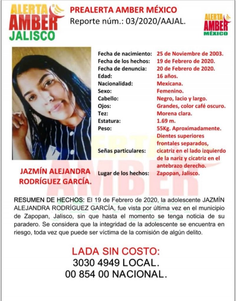 Desde el día 19, no se tienen noticias de Jazmín Alejandra Rodríguez García, de 16 años. De acuerdo con la autoridad fue vista por última vez en Zapopan.