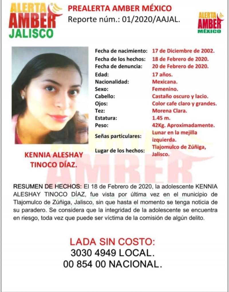 Al día siguiente, en ese municipio, se perdió contacto con Kennia Aleshay Tinoco Díaz, de 17 años, que como seña particular tiene un lunar en la mejilla izquierda.