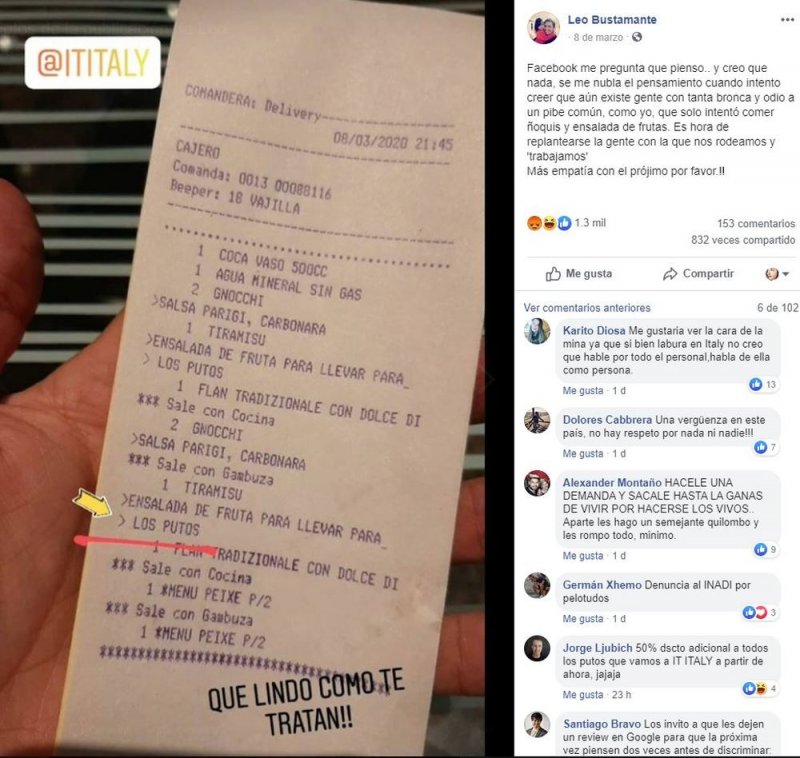 Dejan mensaje homofóbico a pareja gay tras pagar la cuenta