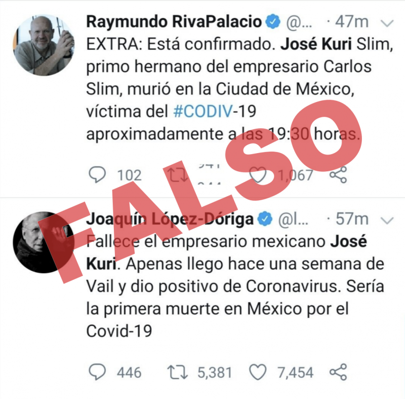 La noche de este domingo, López-Dóriga anunció la primer muerte por coronavirus. Aseguró que se trataba de José Kuri, familiar de Carlos Slim y director del grupo Financiero Inbursa. Sin embargo, la noticia fue falsa. Raymundo Riva Palacio también informó en el mismo sentido.