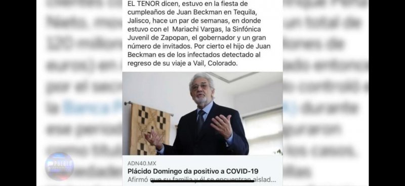 Un par de semanas antes de decretar la alerta sanitaria por COVID-19 y de suspender todas las actividades económicas, escolares y sociales, el gobernador de Jalisco, Enrique Alfaro, asistió a una fiesta privada donde estuvieron presentes dos personajes públicos que posteriormente fueron detectados como casos positivos para Coronavirus: El empresario Juan Domingo Beckmann y el tenor Placido Domingo.