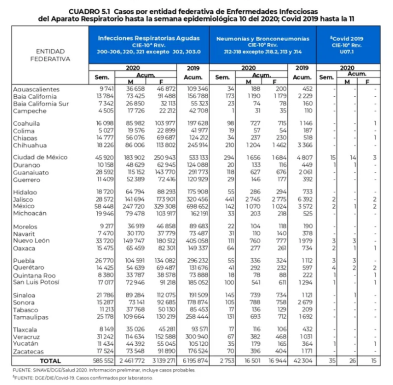 Según datos de la Dirección General de Epidemiología, los reportes de casos de neumonía y bronconeumonía y en el Estado de México -de enero a mediados de marzo de 2019- fueron 3 mil 572, mientras en lo que va de 2020, se han contabilizado 2 mil 094.