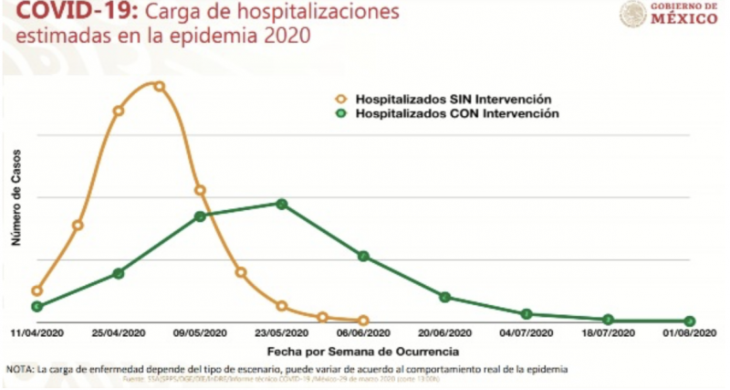 Por otro lado, la curva verde muestra que, con una intervención de nuestra parte, siguiendo las medidas de sana distancia contra el Coronavirus, México podría aplazar el contagio. Como ya ha repetido el funcionario, es imposible frenar del todo la transmisión. Sin embargo, al disminuir la interacción, se pueden salvar vidas ya que los enfermos graves no se dispararían en un sólo punto. Así, los hospitales no se saturarían y no caeríamos en el mismo caso que Italia u otros países.