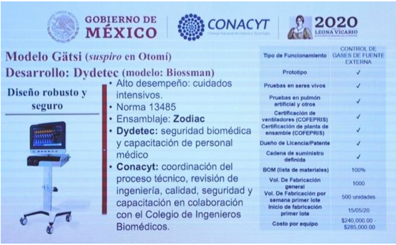 "Estos ventiladores tendrían que ser invasivos, de tecnología 100% mexicana, más económicos que los que pueden comprar en el extranjero y equipos con alta calidad y seguridad biomédica", anunció.