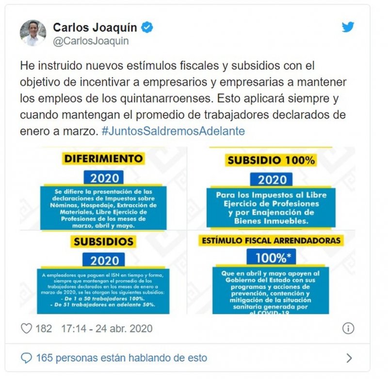 “Al margen de eso, pensamos que se debe crear un certificado ‘COVID-free’ para que todo el estado, toda la industria turística del estado, restaurantes, parques ecoturísticos, discotecas, marinas, casinos (…) nos lancemos en esa fecha como ‘COVID-Free destination’”, expresó.