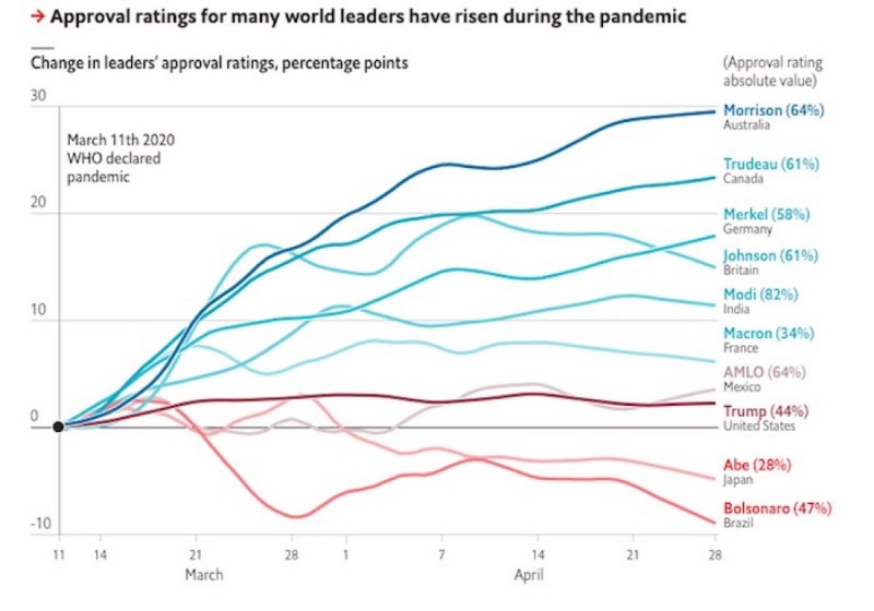 The Economist cuenta que muchos regímenes han sido derrocados por una plaga. “Pero hasta ahora, COVID-19 está teniendo el efecto contrario. La mayoría de los líderes han visto aumentar sus índices de aprobación, incluso cuando la enfermedad ha matado al menos a 250 mil personas. Morning Consult, un encuestador, descubrió que un grupo de diez políticos ha disfrutado de una ganancia promedio de nueve puntos porcentuales desde que la Organización Mundial de la Salud decretó una pandemia el 11 de marzo. El sentimiento se ha sentido ampliamente en Australia y Canadá, India y Alemania”.