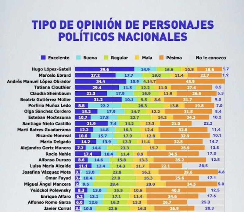 Marcelo Ebrard, secretario de Relaciones Exteriores tiene 27.2 % de opiniones en “excelente” y 17.7% en “buena”; debajo de ellos se encuentra Andrés Manuel López Obrador, presidente de la República Mexicana, la primera dama Beatríz Gutiérrez Müller y la jefa de gobierno de la Ciudad de México, Claudia Sheinbaum, entre los personajes con mejor reputación, de acuerdo al estudio.