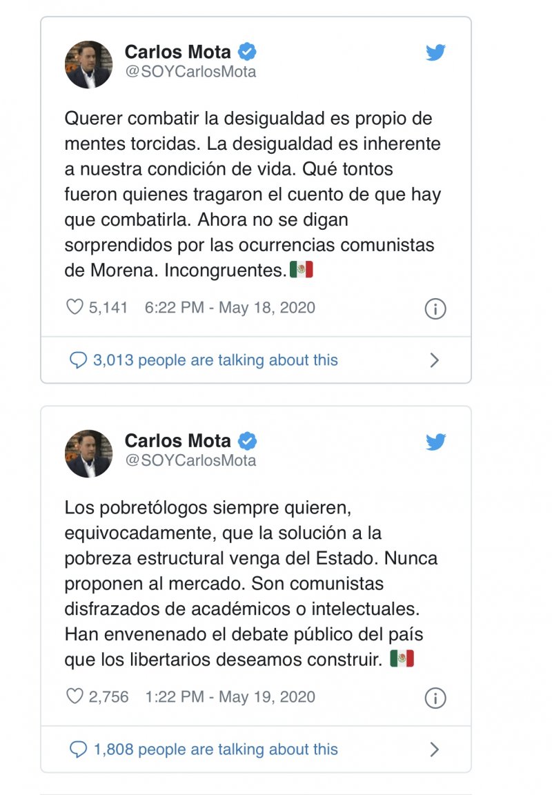 El periodista de TV Azteca, Carlos Mota, especializado en temas financieros y económicos, lanzó una serie de polémicos tuits en los que criticó con vehemencia a quienes emprenden acciones para combatir la desigualdad económica de México. En palabras del comunicador egresado del ITAM, es «de mentes torcidas» querer combatir la desigualdad.