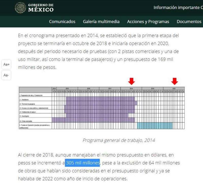 La diferencia entre uno y otro es de 94 mil millones de pesos, pues hasta 2018, antes de ser cancelado, el presupuesto del NAIM Texcoco se había elevado hasta los 305 mil millones (381 mil millones con el valor de cambio actual) de los 169 mil millones que se había proyectado en un principio.