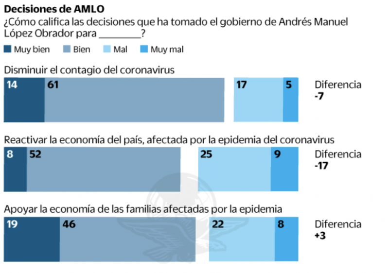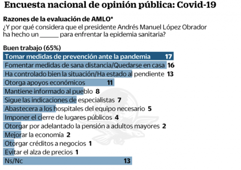 Sin embargo, los números de López Obrador aumentan al preguntar por la gestión del jefe de estado frente a la pandemia de coronavirus, 65% lo evalúa de forma favorable. Aún y cuando este dato implica una caída de 8 puntos respecto al mes pasado, los números le siguen siendo favorables, a pesar de las circunstancias que el covid-19 ha impuesto a la realidad del país.