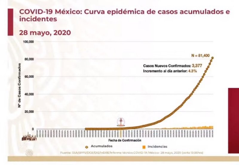 La Secretaría de Salud dio a conocer este jueves que suman 81 mil 400 casos confirmados acumulados de COVID-19 en México, de los cuales 16 mil 315 son activos, mientras que hay 9 mil 44 muertos por la enfermedad.