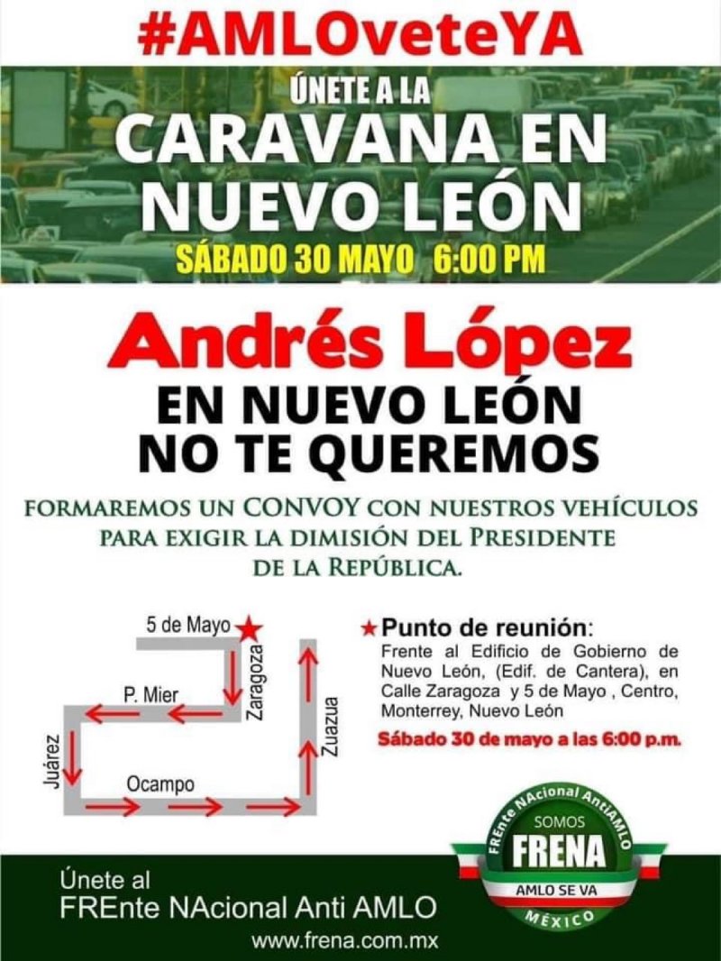 Igualmente, Bringas, todavía accionista deSoriana, está organizando un convoy en el centro de Monterrey para reclamar por la renuncia del mandatario; sin embargo, la convocatoria es desde la entidad llamada «Frenaaa«.