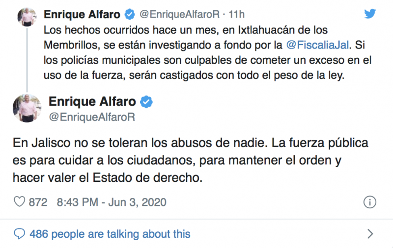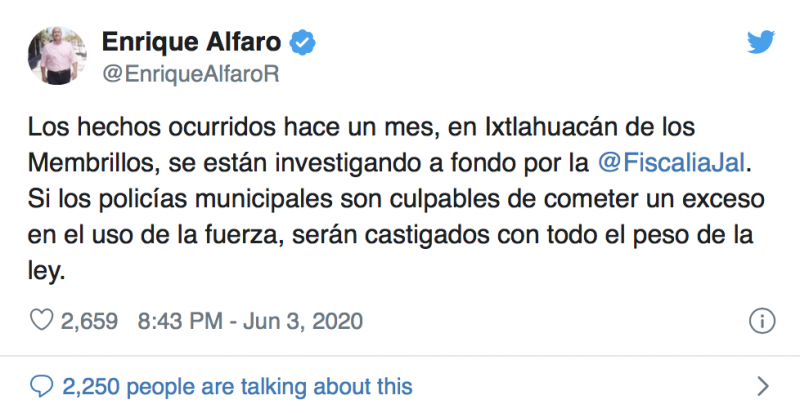 A través de un hilo de Twitter detalló que en «en Jalisco no se toleran los abusos» por lo que lo sucedido en Ixtlahuacán será investigado por la Físcalía del estado y en caso de que miembros de la policía municipal estuvieran implicados serían castigados "con todo el peso de la ley". Asimismo, pidió que el manejo "malintencionado" de la información no generara confusión entre los ciudadanos.