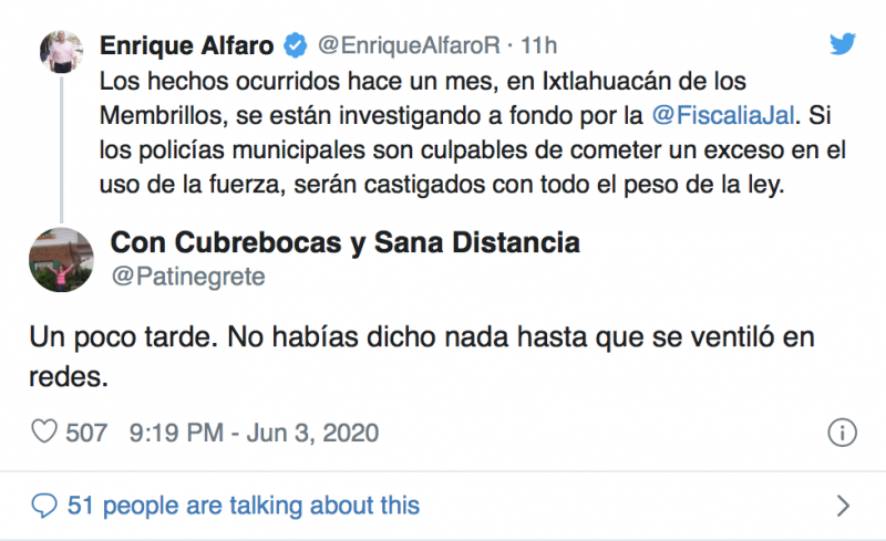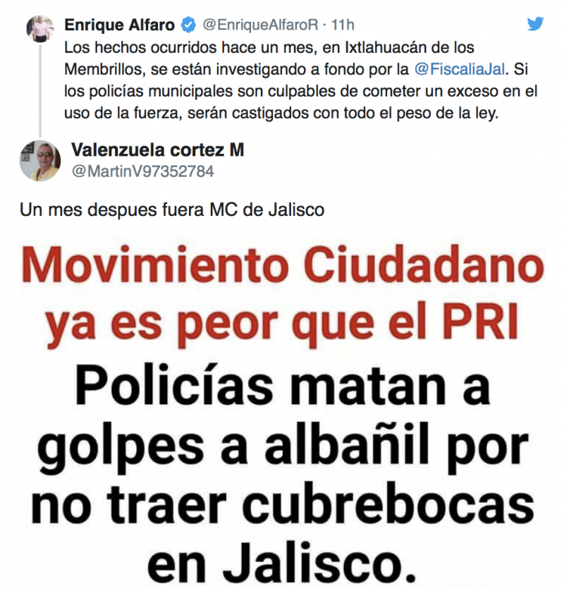 Después de un mes y vía su cuenta oficial de Twitter, el gobernador Enrique Alfaro se deslindó y defendió de la atroz muerte de Giovanni López, quien fuera golpeado hasta la muerte por NO TRAER CUBREBOCAS por la policía municipal de Ixtlahuacán de los Membrillos, pues a un mes de su muerte se dieron a conocer las circunstancias en las que ocurrieron los hechos. La defensa de Alfaro solo logró que las redes se encendieran en su contra, pues argumentaron que era inaceptable que a 4 semanas de los hechos apenas se hiciera un pronunciamiento por parte del mandatario estatal.