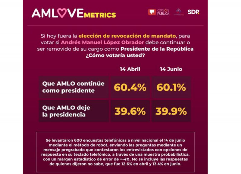 El 14 de junio se levantaron 600 encuestas telefónicas a nivel nacional mediante el método de robot. La pregunta se formuló al responder a un mensaje pregrabado que contestaron los entrevistados con opciones de respuesta en su teclado telefónico. La muestra fue probabilística, con un margen estadístico de error de +-4%. No se incluye las respuestas de quienes dijeron “no sabe”, que sumó 13.4% (14.6% en abril pasado).