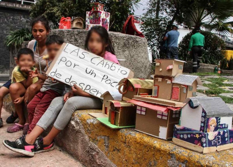 Las cambio por un poco de despensa”, señala un letrero también hecho de cartón que muestra una niña, mientras su madre y sus hermanos posan para la foto.