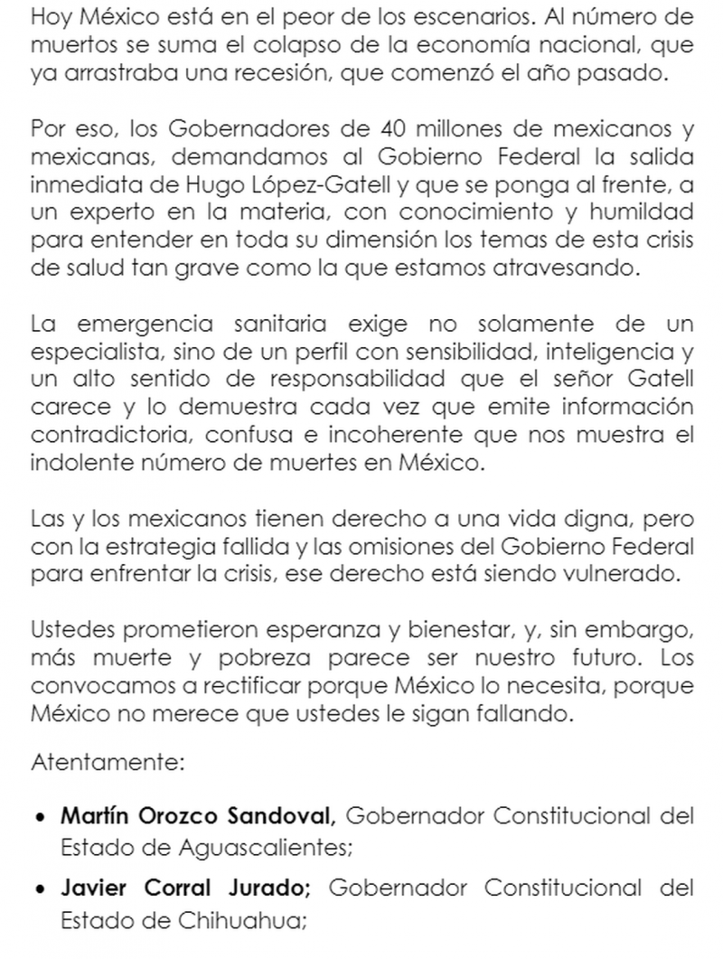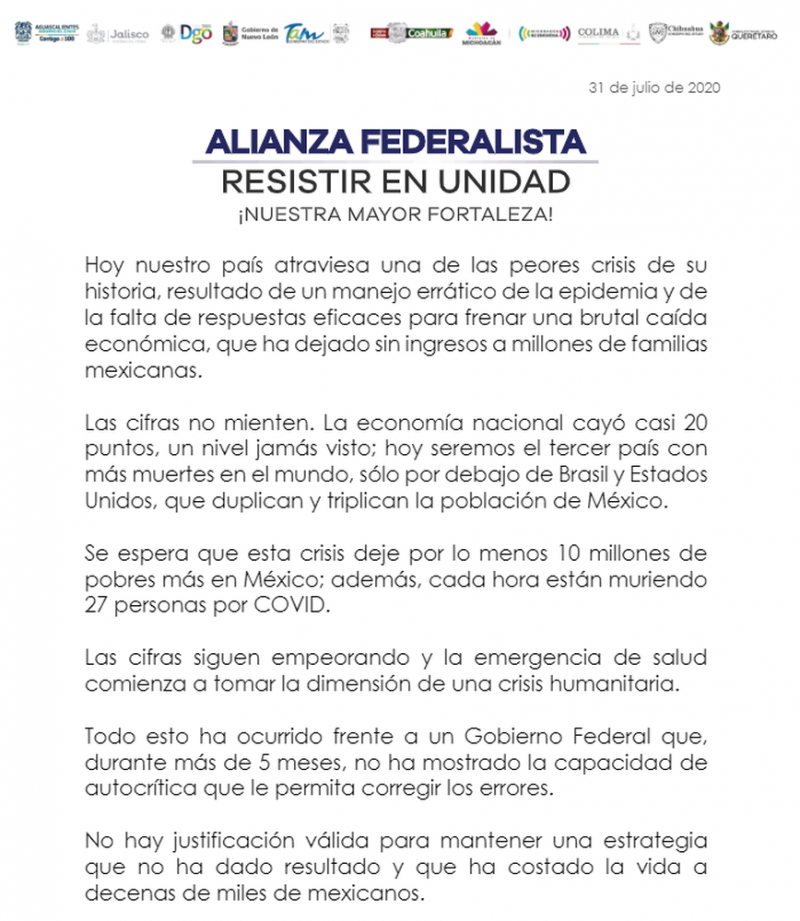 la Alianza Federalista firmaron una carta para solicitar la reinicia inmediata