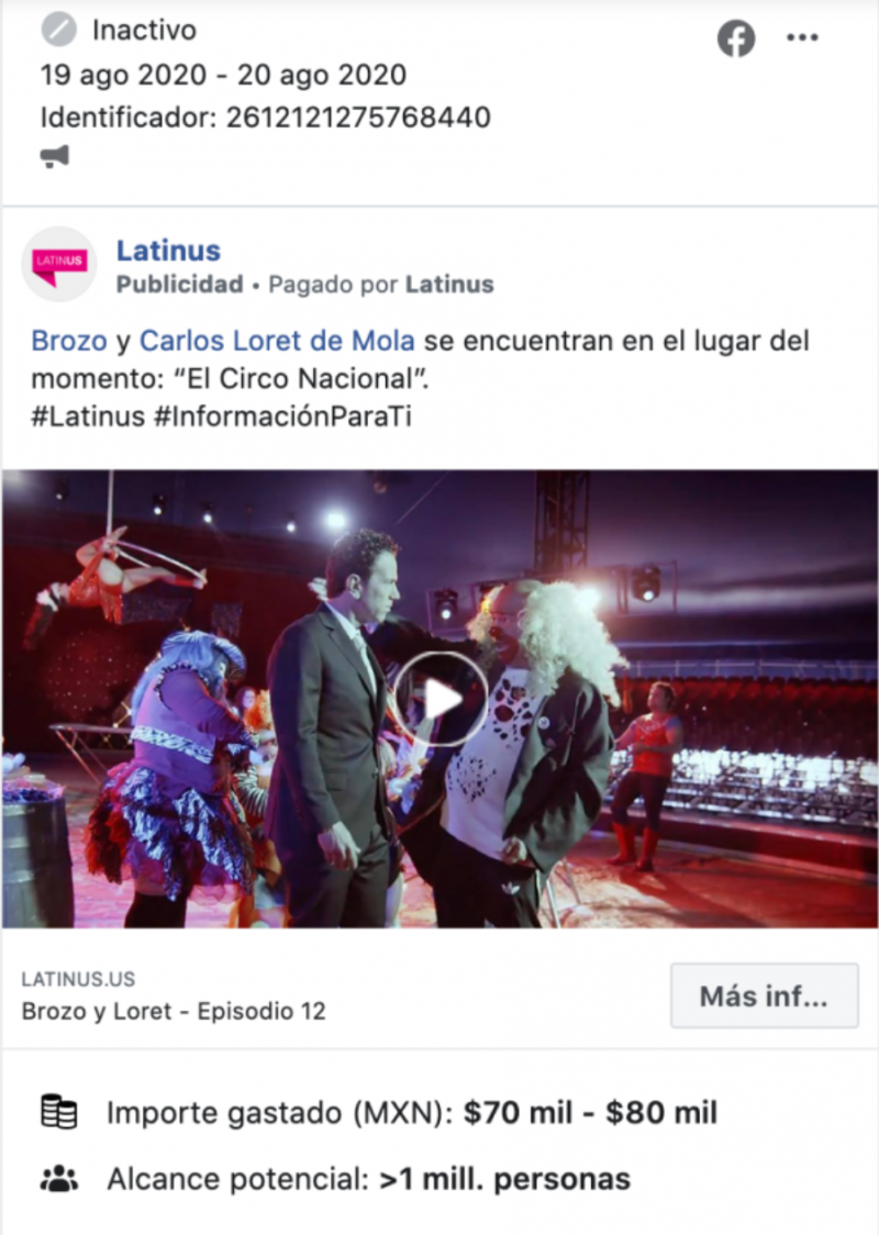 De acuerdo con Polemón, Loret de Mola pagaría esa cantidad tan solo para promocionar su episodio 11, el exconductor de Primero Noticias, extendió a la red social entre 70 mil y 80 mil pesos, por lo que a cambio de la cuantiosa cantidad, facebook le proporcionó un alcance a más de un millón de personas. La pauta se dio del 14 al 16 de agosto.