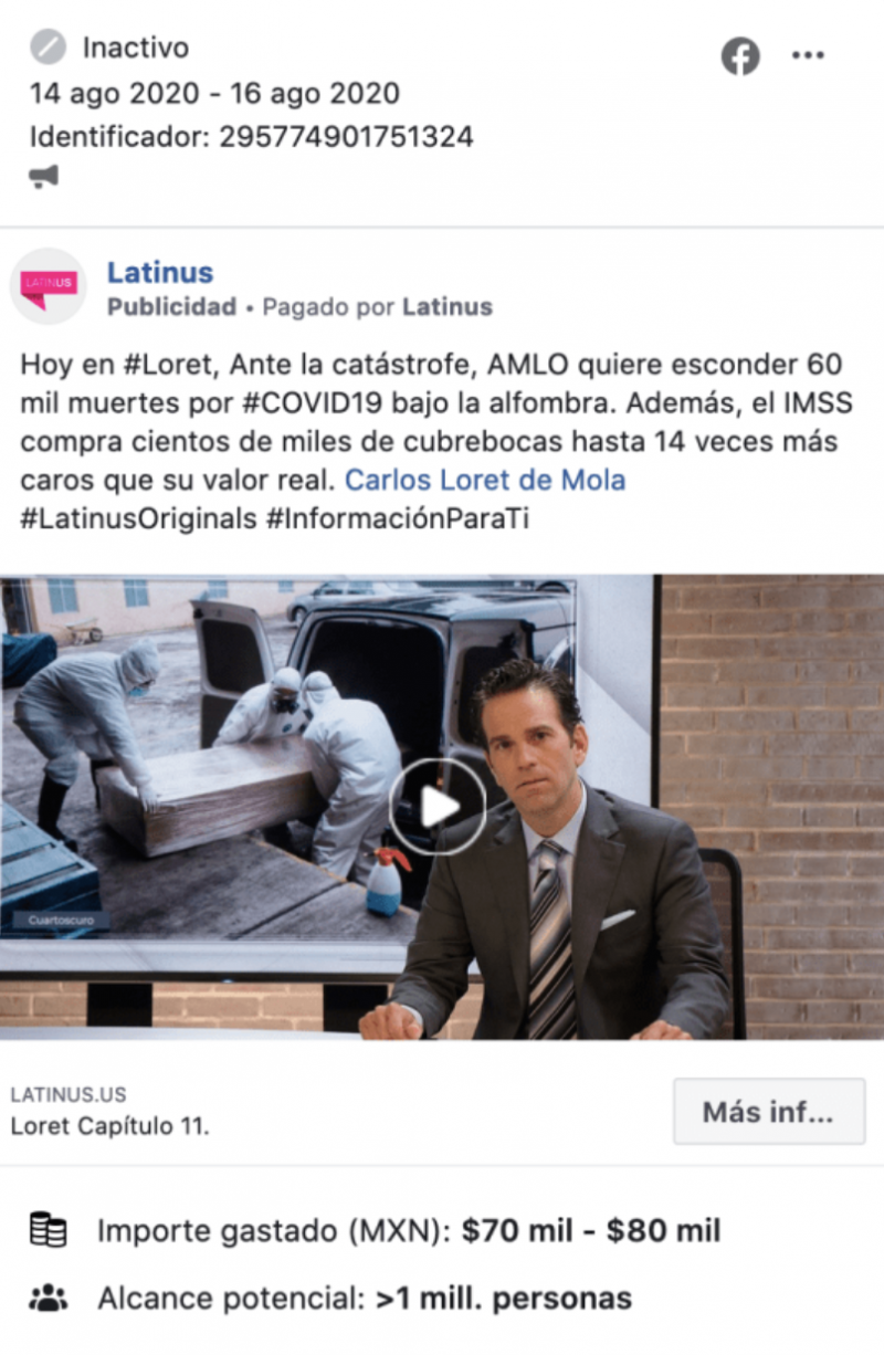 Cabe mencionar que si sumamos los costos de publicidad entre el 14 y 20 de agosto, Loret de Mola gastó más de 100 mil pesos, eso sin mencionar los gastos adicionales que tiene la producción de su programa. Sin embargo, sus transacciones surtieron efecto, pues el vídeo del 19 de agosto, tuvo 31 mil reacciones y más de siete mil comentarios y fue compartido más de 12 mil veces.