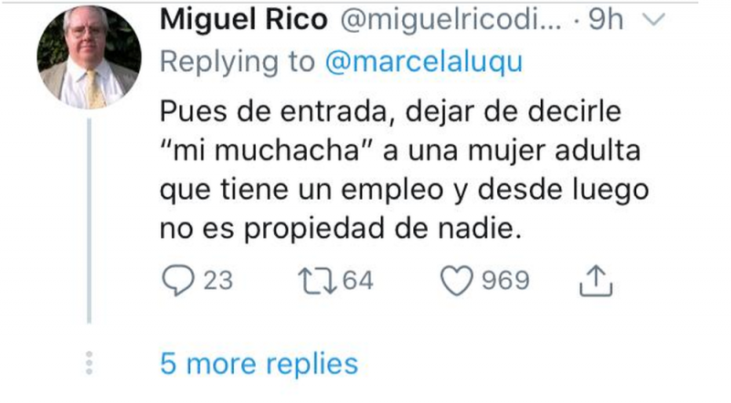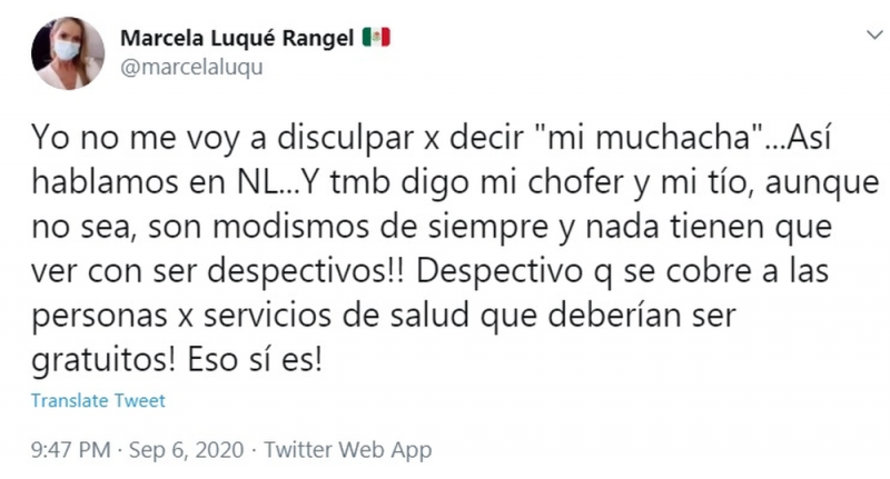 “Yo no me voy a disculpar x decir “mi muchacha”…Así hablamos en NL…Y tmb digo mi chofer y mi tío, aunque no sea, son modismos de siempre y nada tienen que ver con ser despectivos!! Despectivo q se cobre a las personas x servicios de salud que deberían ser gratuitos! Eso sí es!”