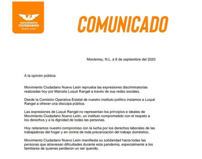 A las 5:38 p. m. de este 6 de septiembre, Movimiento Ciudadano Nuevo León lanzó un comunicado en Twitter.