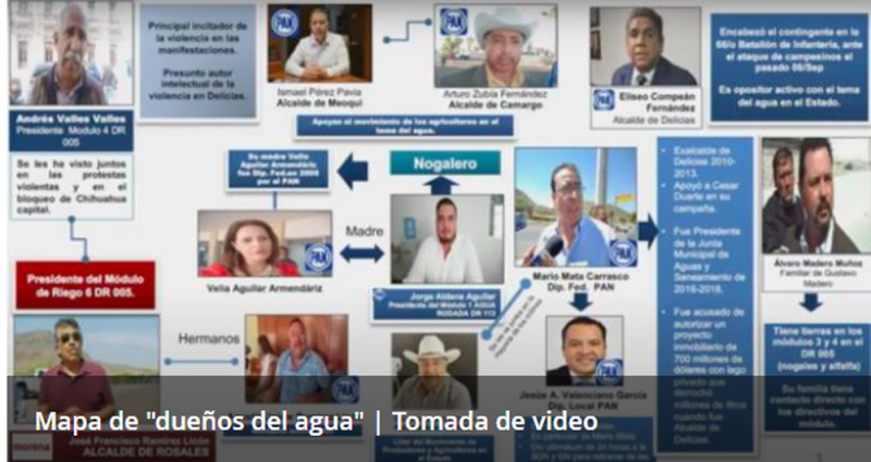 En la mañanera de este 11 de septiembre, el mandatario exhibió a personajes de los partidos Acción Nacional (PAN) y Revolucionario Institucional (PRI), a quienes llamó "los dueños del agua" y que organizaron la protesta que derivó en hechos violentos, entre los que destacan los exgobernadores priistas Fernando Baeza Melendez y José Reyes Baeza Terrazas, así como tres alcaldes panistas.