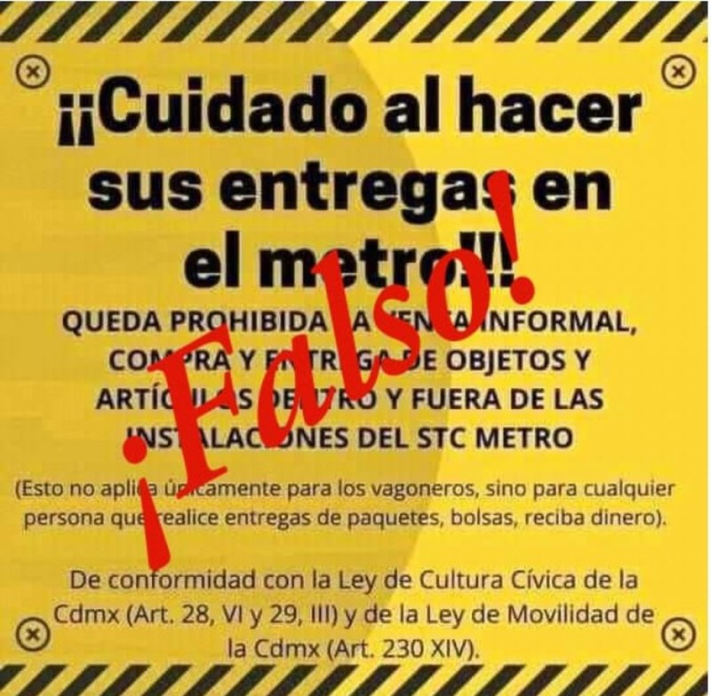 El Sistema de Transporte aclaró que desconoce la procedencia de diversos letreros, colocados en distintas estaciones y que circulan en redes sociales en donde se menciona que queda prohibida la entrega o intercambio de mercancía; y señaló que no son avisos oficiales del Metro.