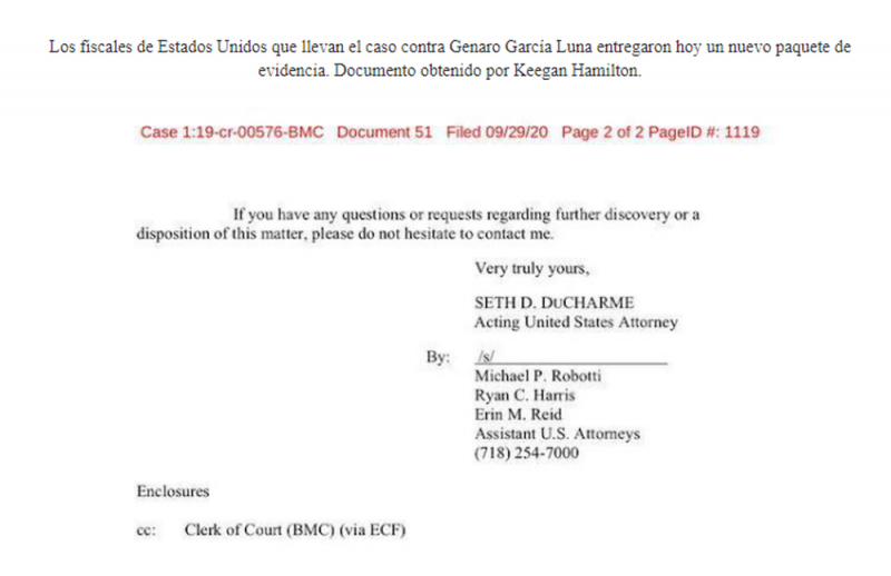 Los fiscales de Estados Unidos que llevan el caso contra Genaro García Luna entregaron hoy un nuevo paquete de evidencia que incluye grabaciones producto de “comunicaciones interceptadas”, “archivos de la policía mexicana” y incluso “libros mayores y registros comerciales y financieros”.